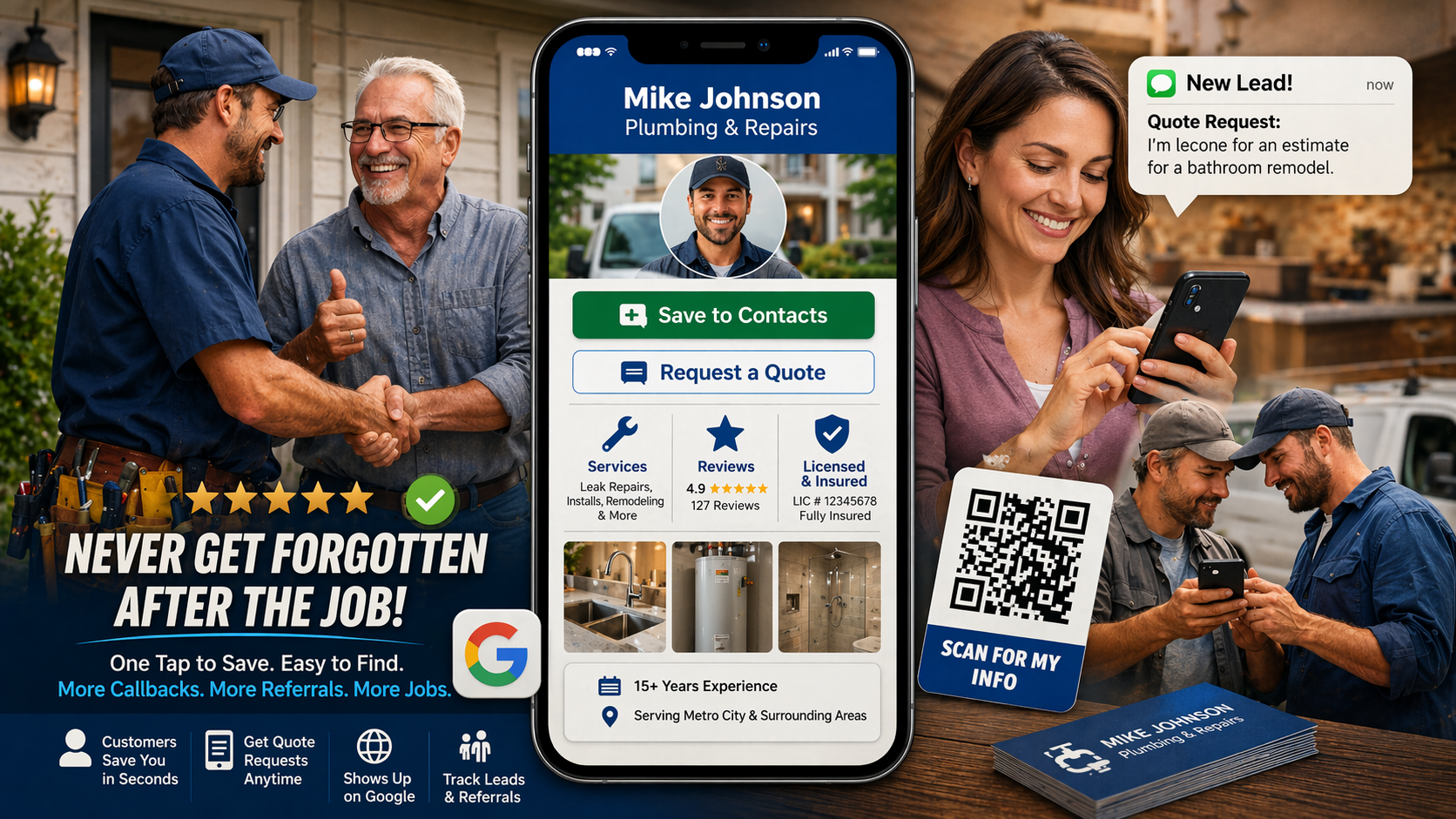 Here is a pattern every contractor knows. You finish a job. The customer is happy. You hand them a paper business card or text them your number. A month later, their friend mentions they need work done. The customer wants to refer you. But the paper card is in a junk drawer. Your number is buried in a text thread from weeks ago. They cannot find you. So the friend Googles "plumber near me" and hires someone else.