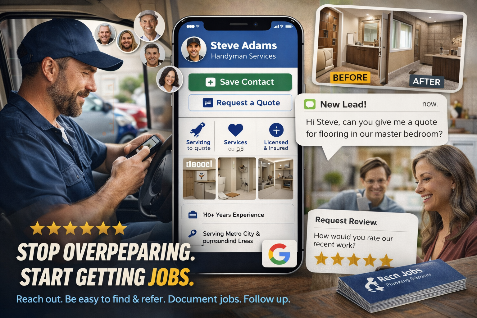 Take before-and-after photos of every single job. Every one. Even the small ones. Especially the small ones. A $200 faucet replacement photographed well is more convincing to a potential customer than a description of a $20,000 bathroom remodel with no pictures.